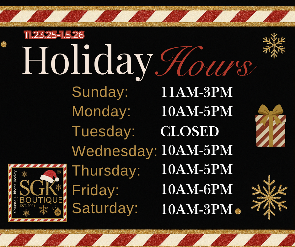 Starting Sunday, November 23, SGK Boutique will be open with extended holiday hours to make your gifting, styling, and celebrating even easier.