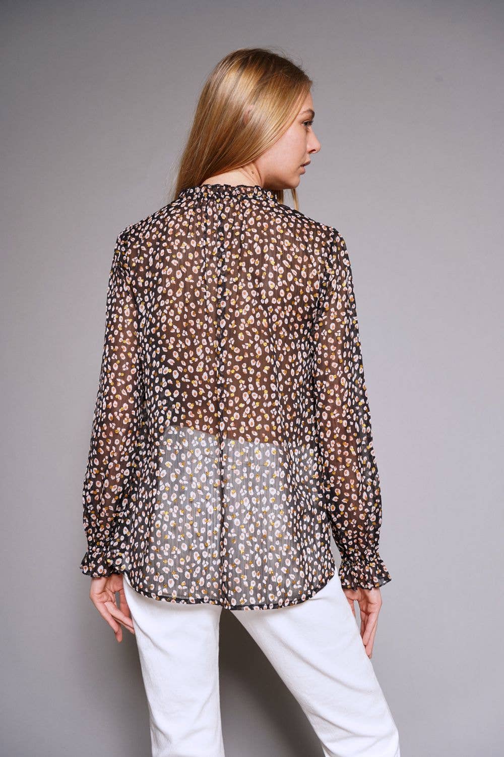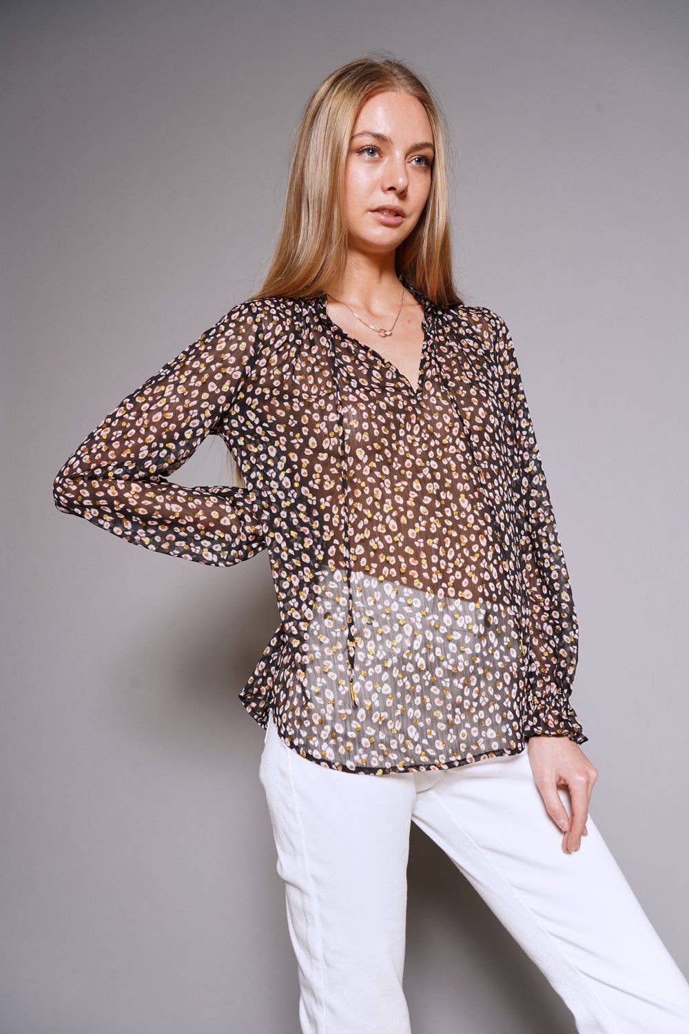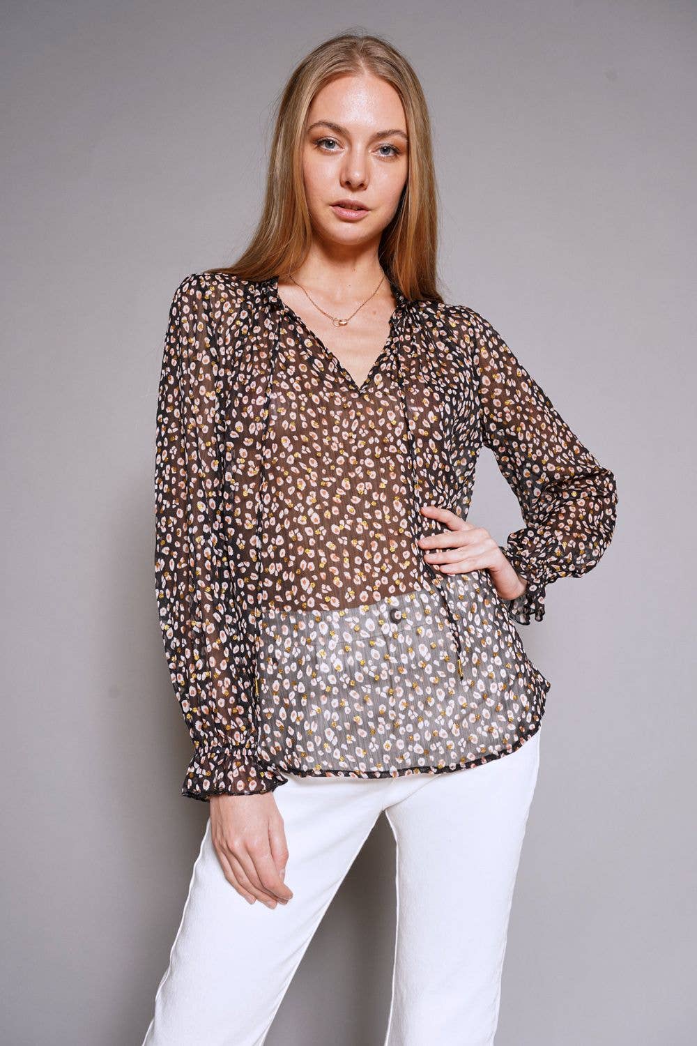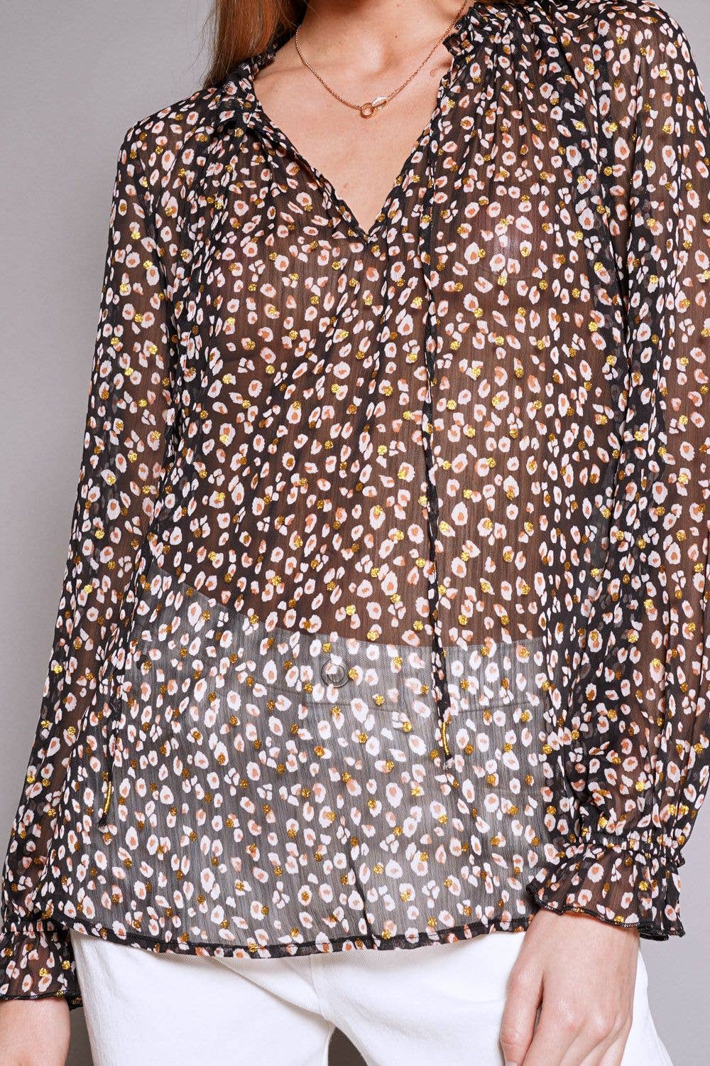 This playful confetti-speckled leopard blouse features a V-neckline with a charming tie strap. Its puff sleeves end in ruffled elastic cuffs, adding a flirty touch. The fabric is semi-sheer, perfect for layering or showing a hint of skin.