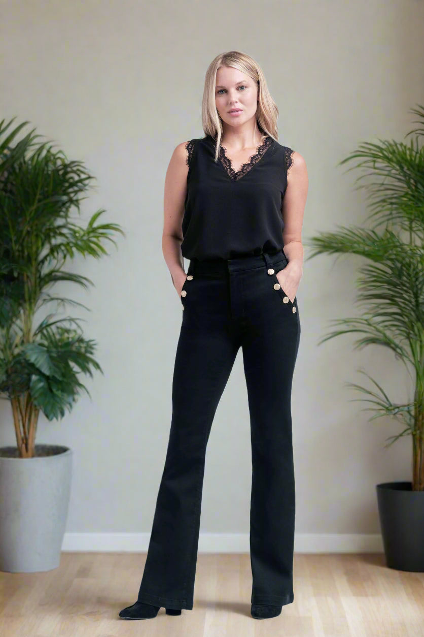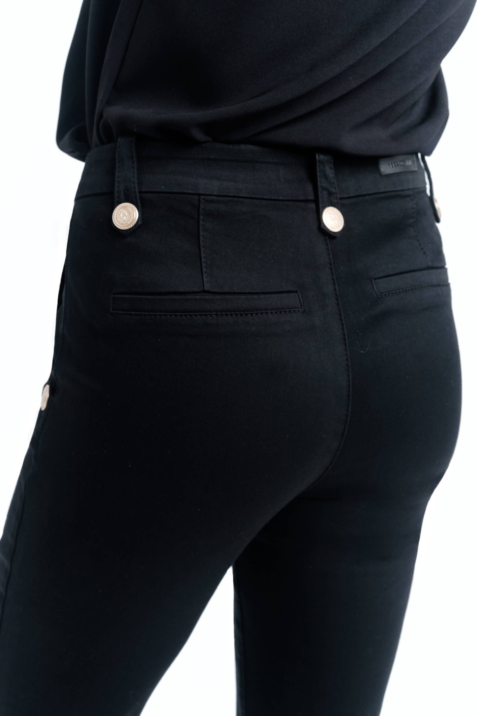 Experience a timeless sense of elegance in these ultra sleek and comfortable, slim-boot black jeans, adorned with classic gold sailor buttons. The premium materials and construction create a sophisticated and effervescent style that perfectly fits and flatters your silhouette, making you feel confident and stylish.