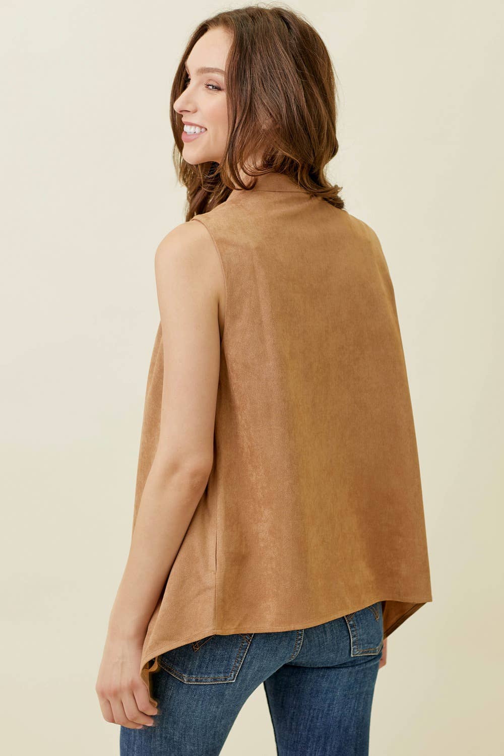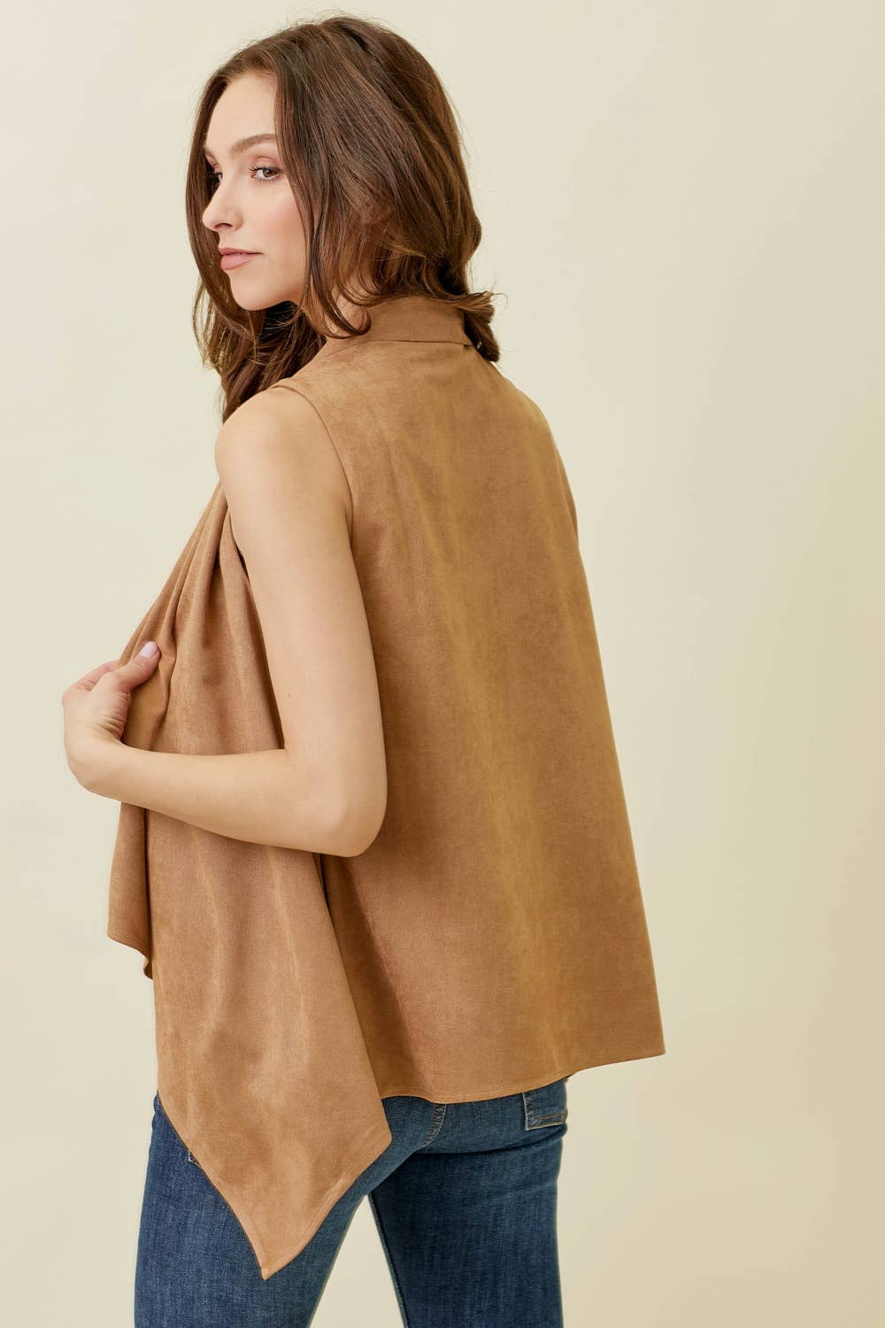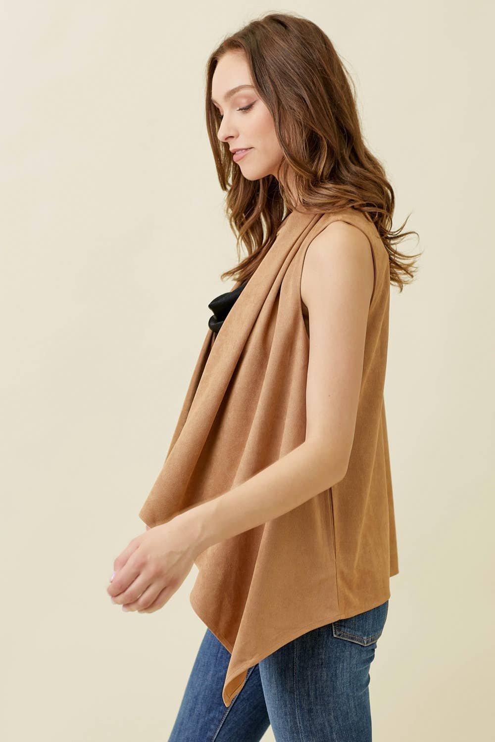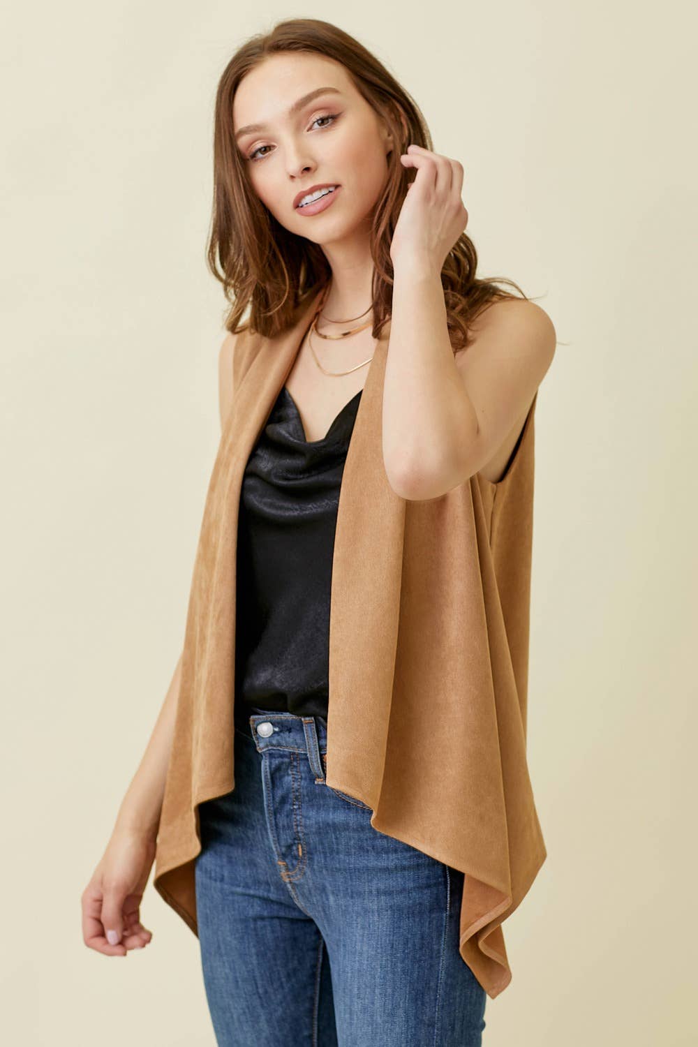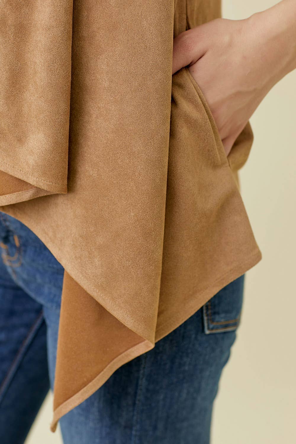 Featuring a soft suede texture and a stylish shawl collar, it adds a touch of effortless cool to any outfit. The open front design invites layering fun, while the hi-lo hem creates a playful silhouette that moves with you. Perfect for those days when you want to stay comfy but still turn heads!