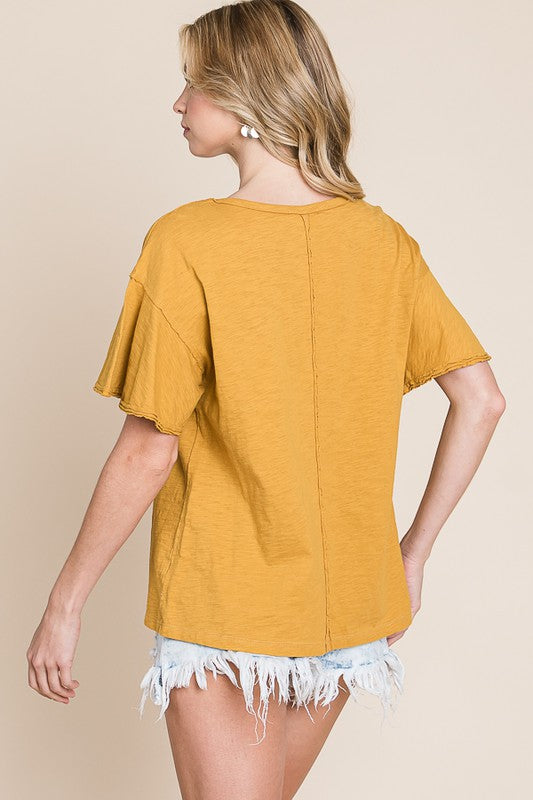 This meticulously crafted knit top features precision short sleeves complemented by intentional raw edge detailing. The strategic unfinished borders create textural contrast against the refined knit construction, demonstrating superior garment architecture while maintaining functional wearability.