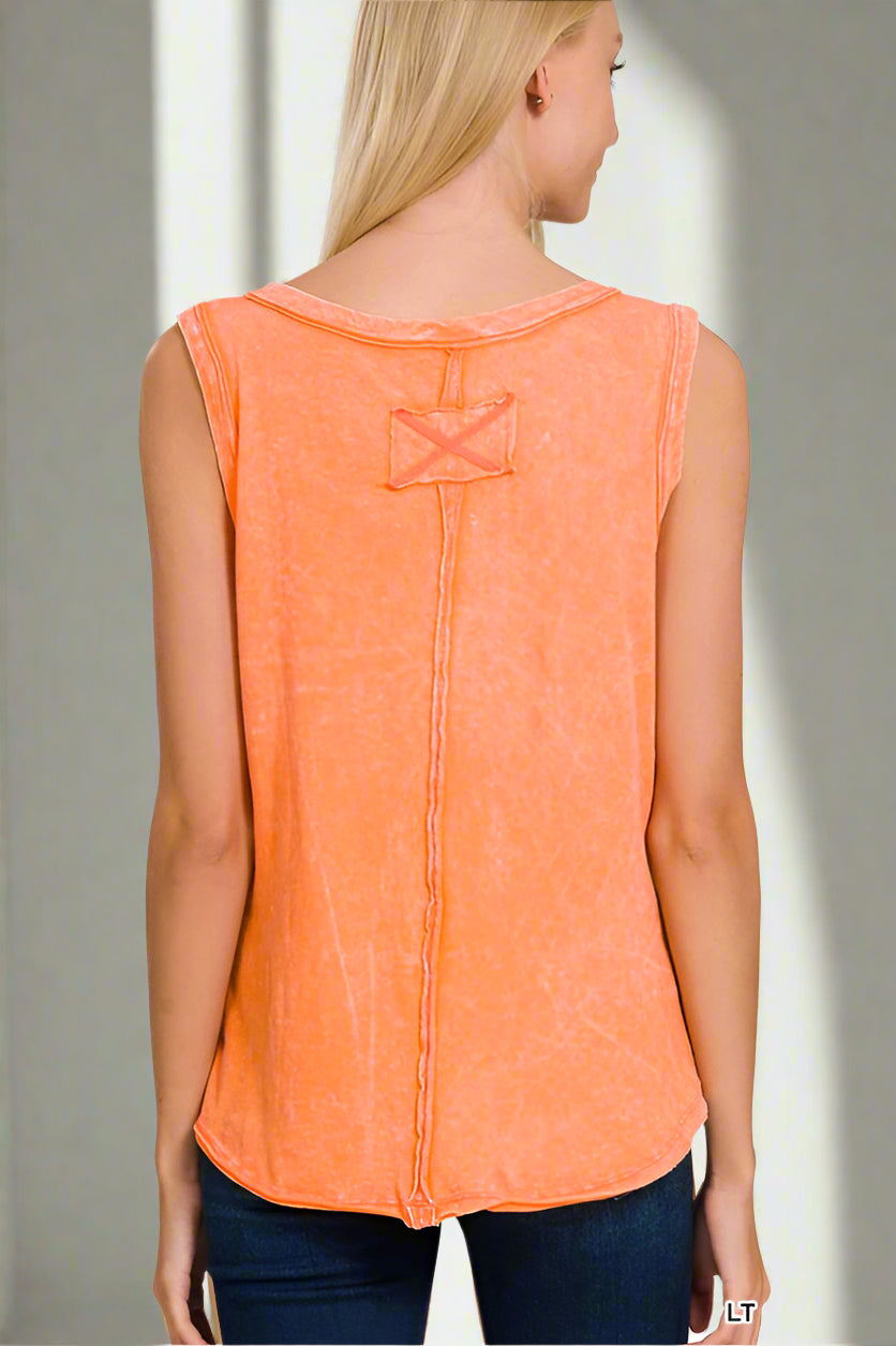 Designed with high-quality materials and a flattering v-neck cut, this sleeveless top will keep you looking and feeling your best. Its unique crinkle wash adds a touch of style while the back patch provides added comfort and functionality. With this top, you'll have the perfect mix of fashion and practicality.