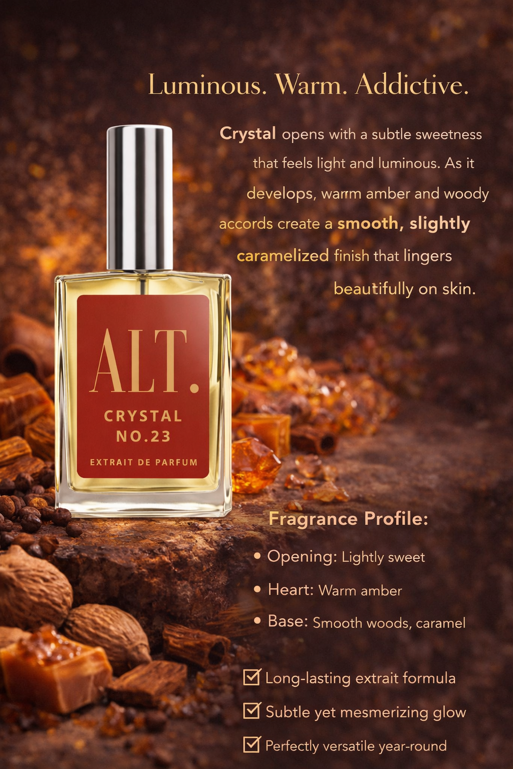 Introducing Crystal 23, a luminous and addictive unisex fragrance inspired by the Baccarat Rouge 540 scent profile. Radiant, airy, and unmistakably luxurious, this extrait de parfum blends warm amber sweetness with woody depth and a soft, almost crystalline finish. Crystal 23 is modern elegance in a bottle, bold yet refined, sweet yet sophisticated. It's the perfectly balanced for both men and women who love sweet amber fragrances with a clean woody undertone. It adapts beautifully to the wearer, making it a versatile signature scent.