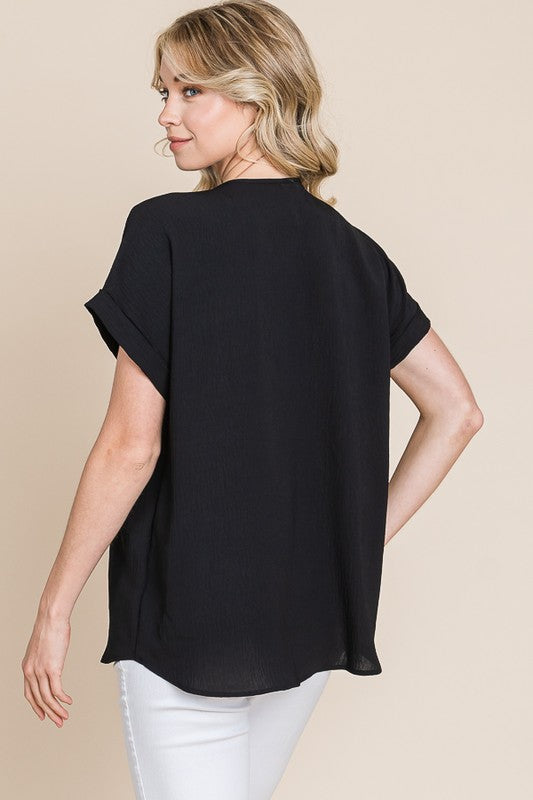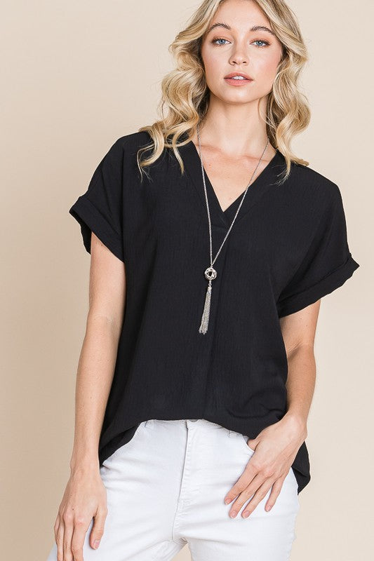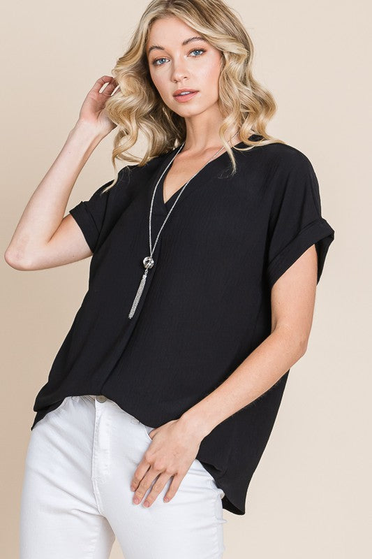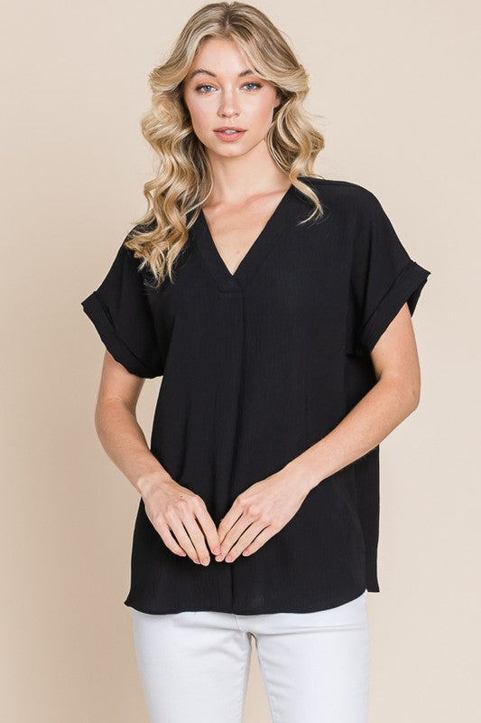 This V-neck dolman blouse combines refined design with exceptional comfort. Crafted from a textured woven fabric, it features elegantly draped short sleeves that create a graceful silhouette. The blouse’s relaxed fit allows for ease of movement while maintaining a polished appearance, making it ideal for both professional settings and sophisticated casual occasions. Its subtle texture adds depth and interest, elevating your ensemble with understated elegance. Pair it effortlessly with tailored trousers or a sleek skirt for a timeless, chic look.