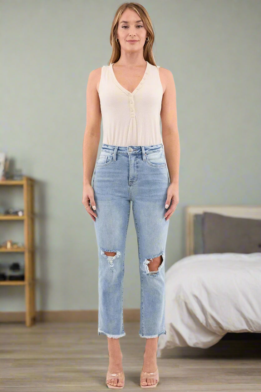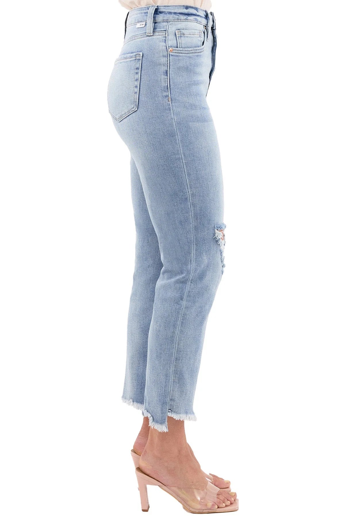 Dylan High Rise Slim Straight Cropped Frayed Jeans, where sleek style meets everyday versatility. These jeans are crafted for women who love a flattering high-rise fit with a slim straight leg that offers a streamlined silhouette. The cropped length is perfect for a modern, on-trend look.