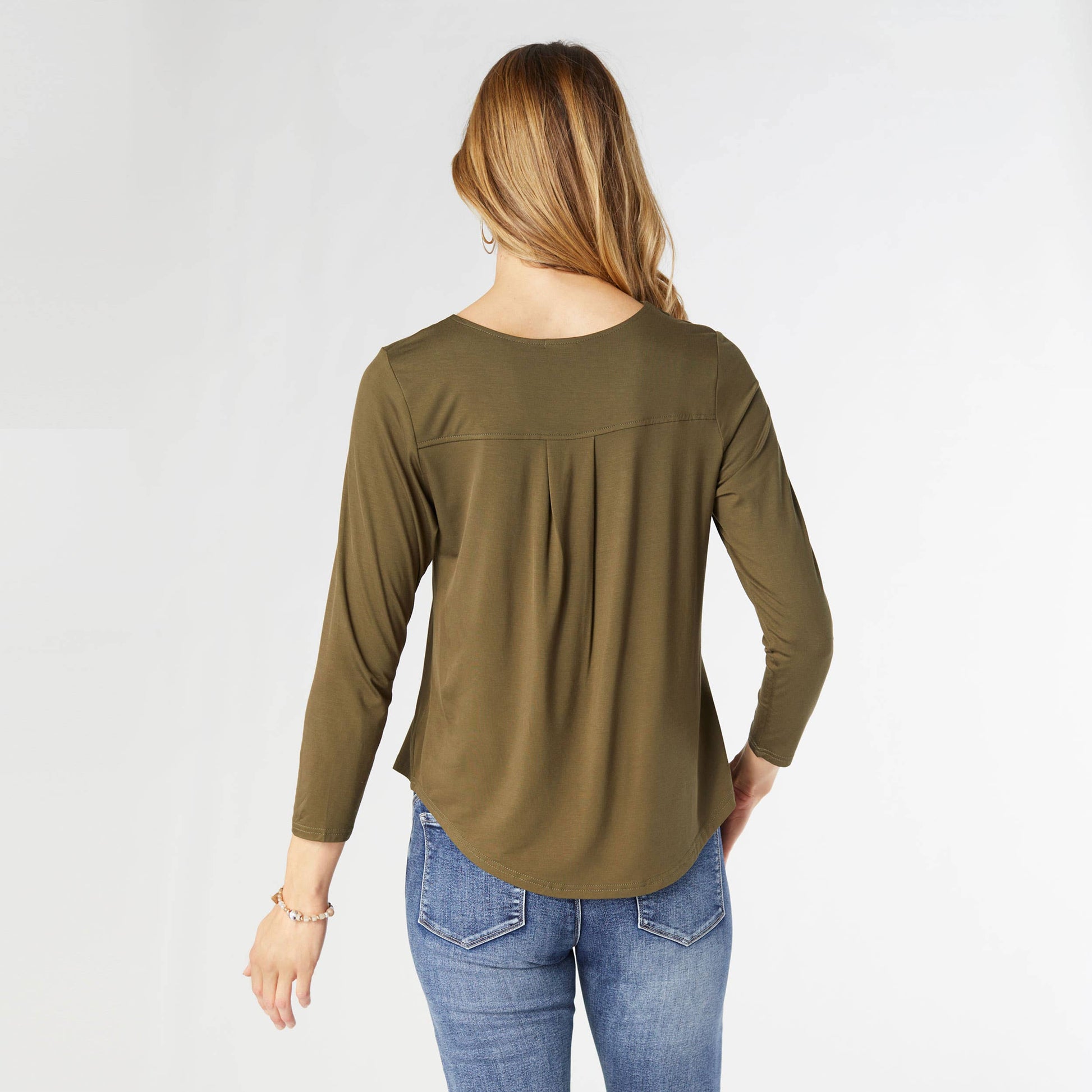The Erin Long Tee is your new go-to for effortless style and comfort. Crafted from super soft fabric with a gentle stretch, it moves with you all day long. The scooped hemline adds a flattering touch, while the pleat back detail gives it a fun, flirty vibe. Lightweight and breathable, it’s the perfect base layer for layering up in fall or wearing solo on those crisp days. Add a splash of playful charm to your wardrobe with this versatile essential that pairs beautifully with your favorite jeans and jackets!