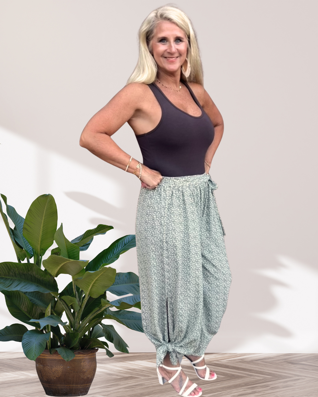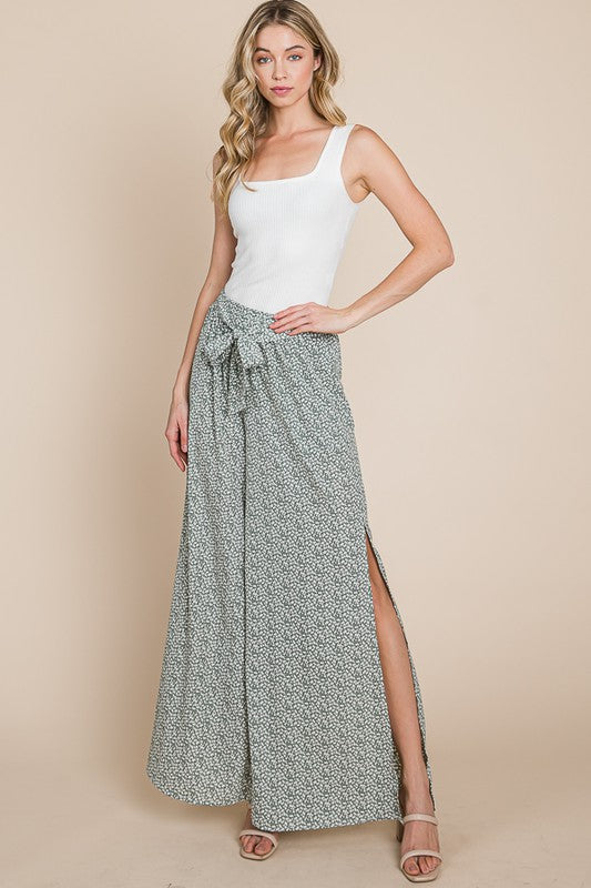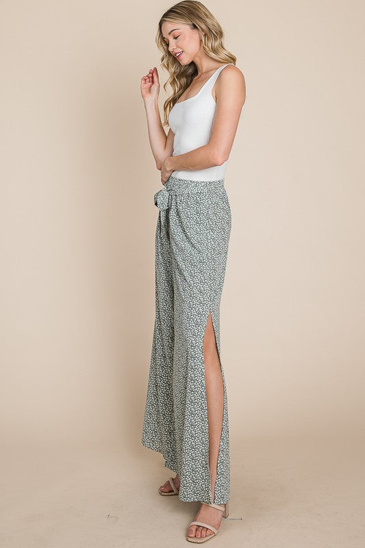 Featuring a delicate floral pattern and crafted from high-quality, breathable fabric, these wide pants provide both style and comfort. The front tie and side slit detail add a touch of elegance, making them suitable for both casual and formal occasions. You'll love the versatility and chic look of these pants - a must-have addition to your wardrobe.