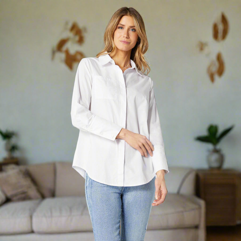The Boyfriend Button-Up shirt is expertly crafted for optimal comfort and style. Its lightweight fabric and long sleeves make it suitable for every season, while the addition of a chest pocket adds a practical element. The button-up design adds a sophisticated and effortless touch, making this a must-have addition to any wardrobe. Elevate your style game with this versatile shirt.