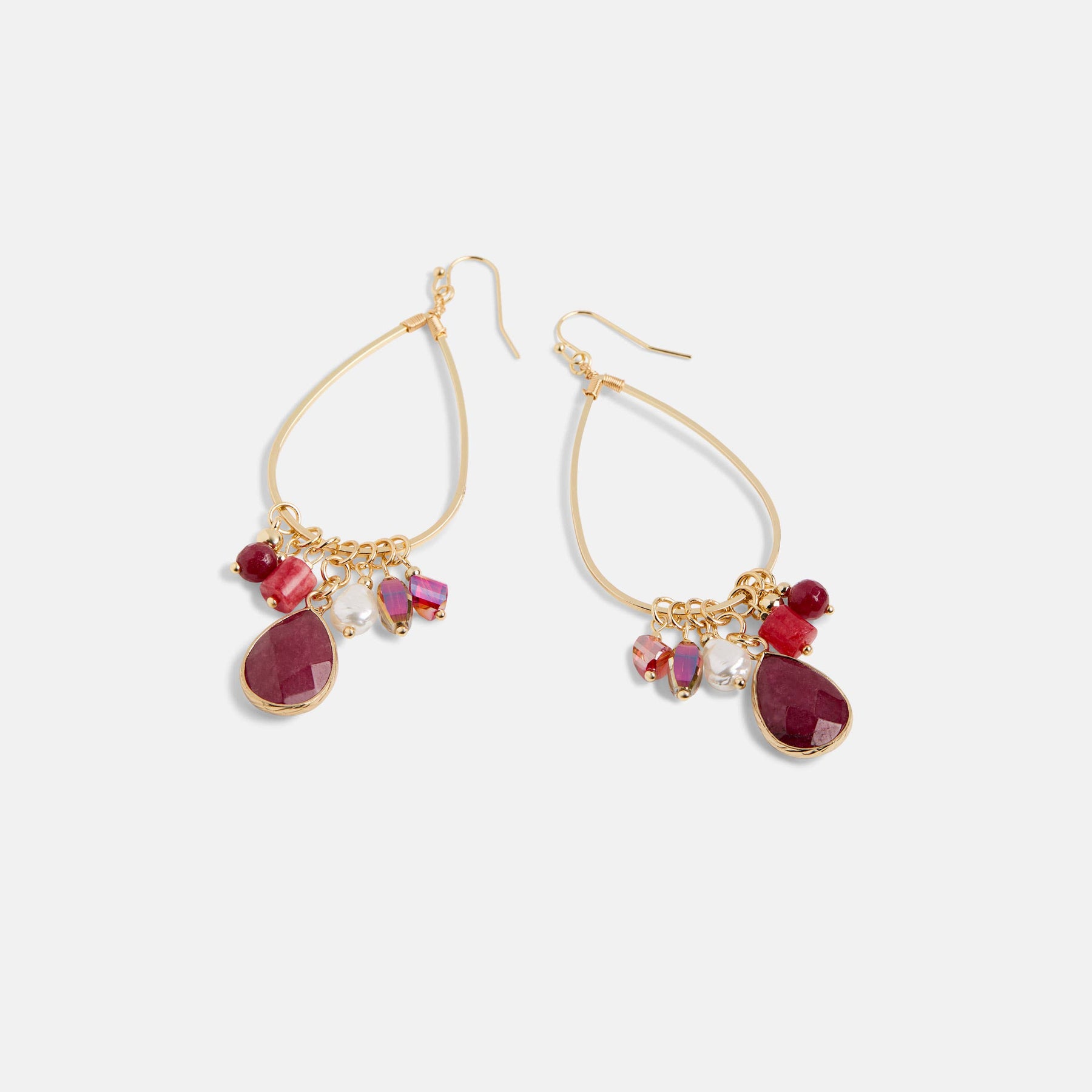Make a sophisticated statement with these Teardrop Gemstone Earrings, where elegance meets artistry. Each earring features a delicate gold teardrop frame adorned with a cluster of faceted black and smoky gray stones, accented by a touch of pearl shimmer for contrast. Lightweight yet eye-catching, these earrings offer the perfect balance of sparkle and movement, ideal for both casual chic and formal wear.