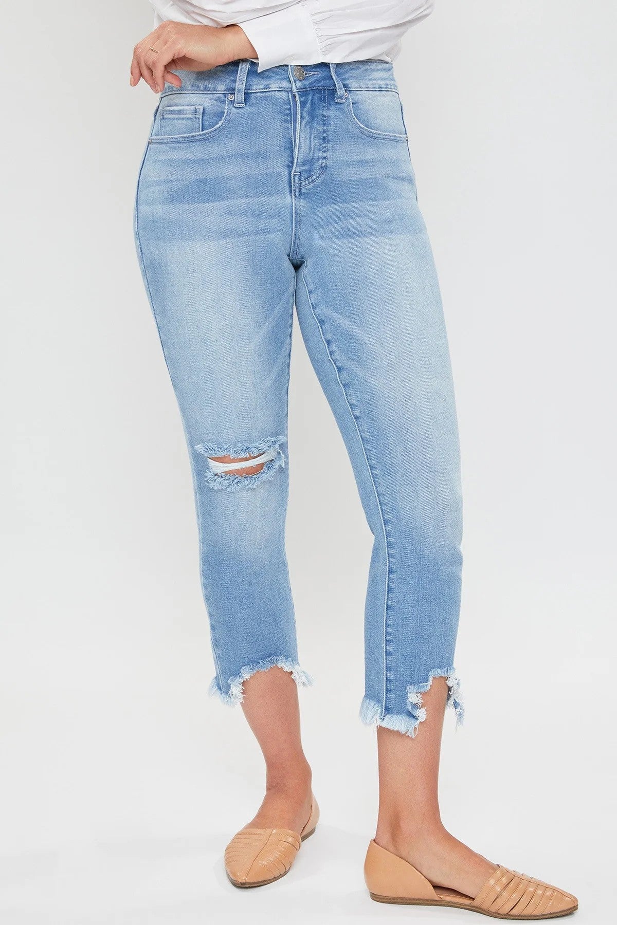 Our Women's Vintage High Rise Frayed Hem Ankle Jeans with Lyrca feature five-pocket construction, single-button closure with front zip, frayed hem, light destruction, and belt loops. This garment contains LYCRA fiber for advanced stretch and is made of vintage denim. It moves with you throughout the day for a comfortable, flexible fit. Wear these jeans to your next barbeque or outdoor party.