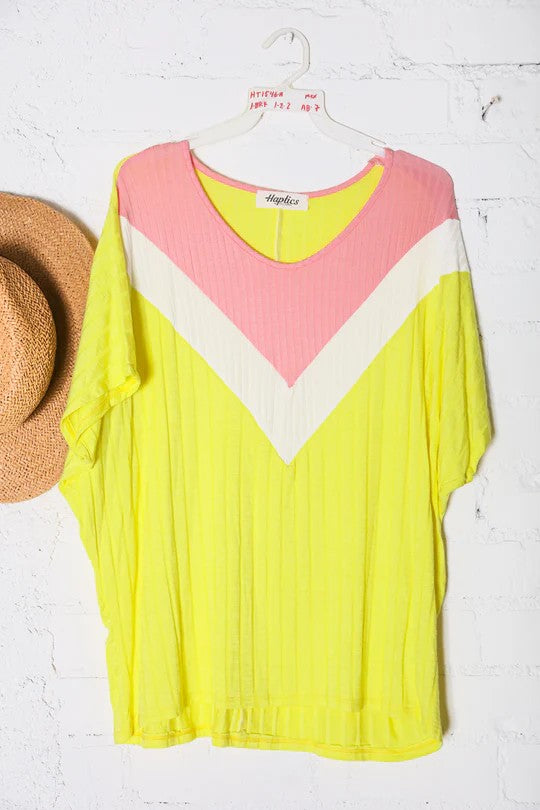 With a flattering V-neckline and a modern color-block design, this top brings effortless style to any outfit. Its dolman sleeves add a touch of sophistication and versatility to this go-to piece.