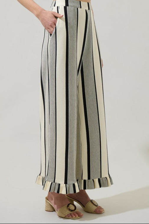 Add a splash of fun to your wardrobe with the RUFFLE STRIPE pants. Its playful ruffle hem dances with every step, while the bold stripe pattern brings a fresh, eye-catching vibe. The stylish overlay adds a touch of flair, making it perfect for both casual outings and special occasions. Plus, the side-zip makes slipping in and out effortless, so you can focus on enjoying your day in comfort and style. Embrace your playful side with this lively and chic piece!